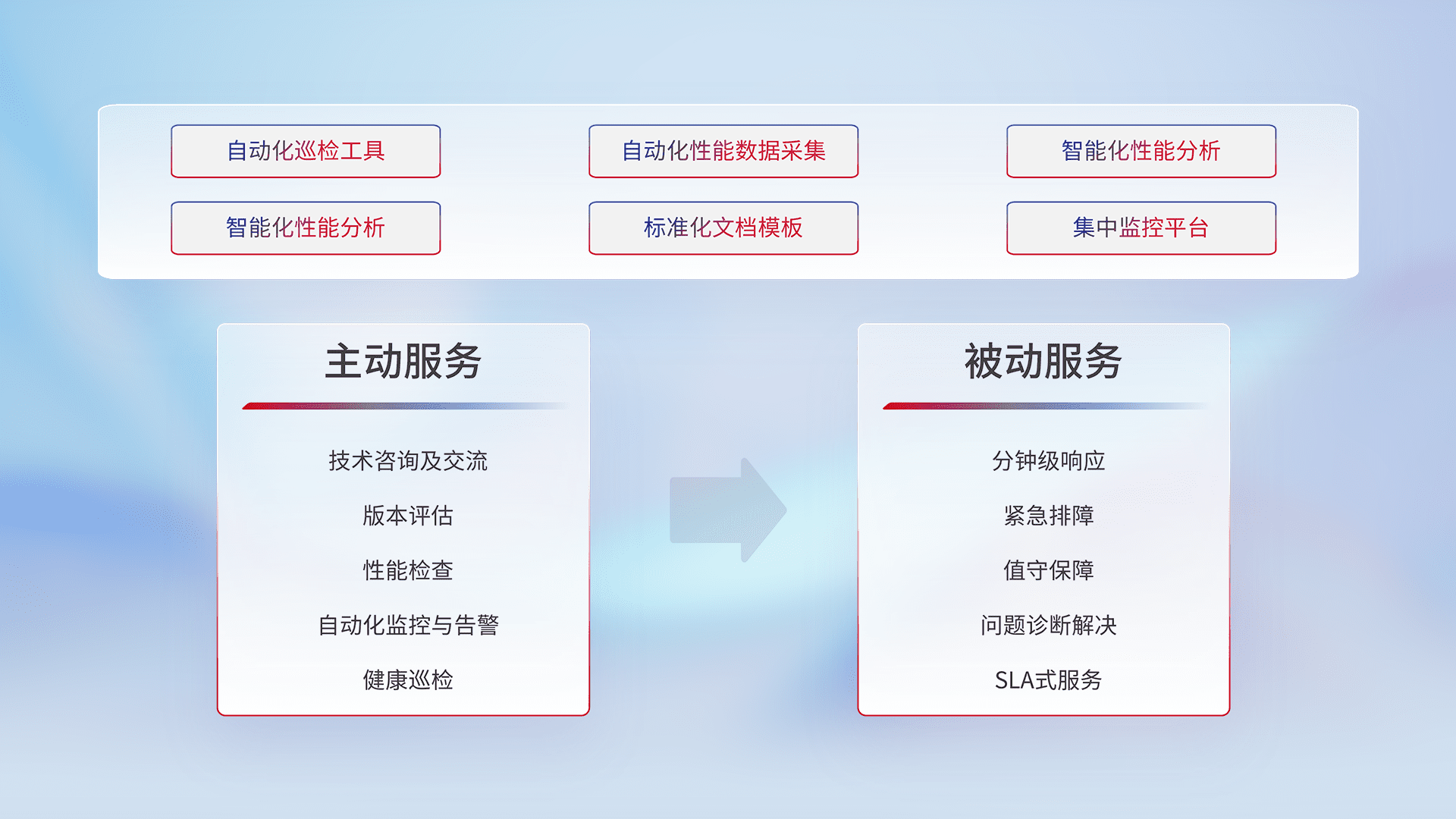 智能化工具和标准化文档,,,保障服务质量,,,,提供主动服务(包含技术咨询、、版本评估、、、、性能检查、、、、自动化监控与告警、、、、健康巡检)和被动服务包含(分钟级响应、、、、紧急排障、、值守保障、、问题诊断解决、、、、SLA服务)。。。